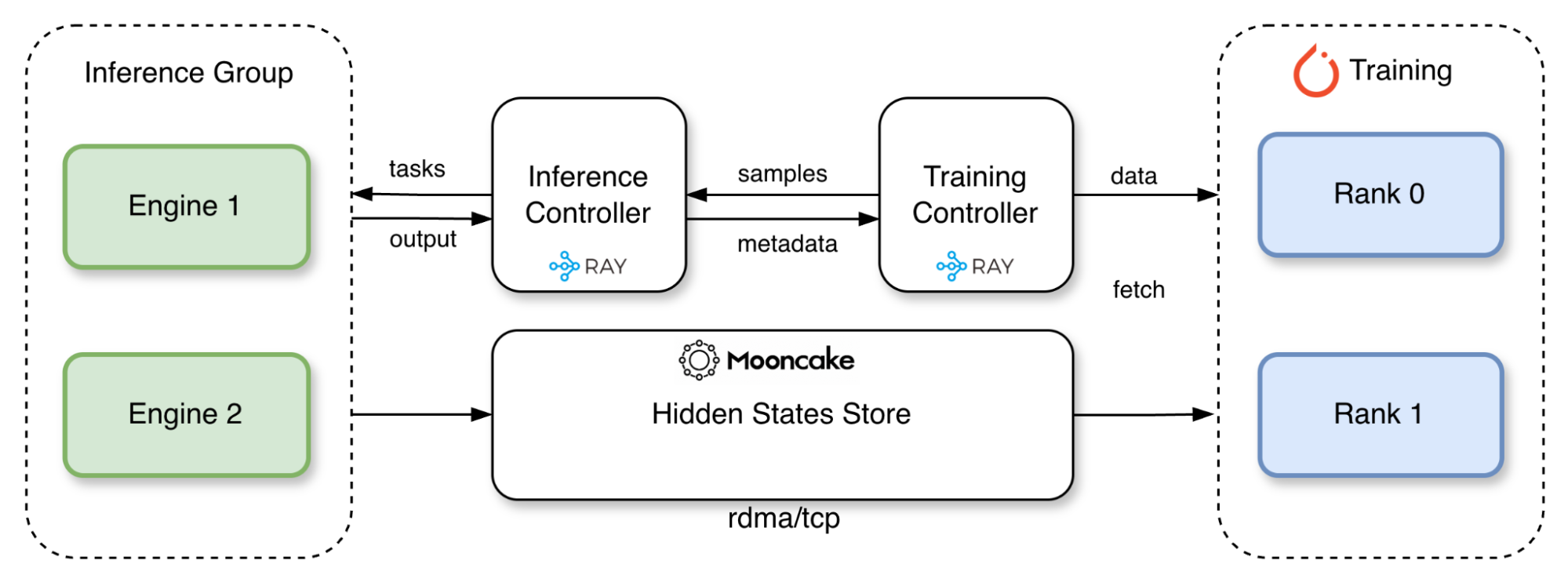 No storage overhead. Hidden states stream directly from inference to training via RDMA/TCP. No data is offloaded to the disk, eliminating file system pressure and serialization costs.