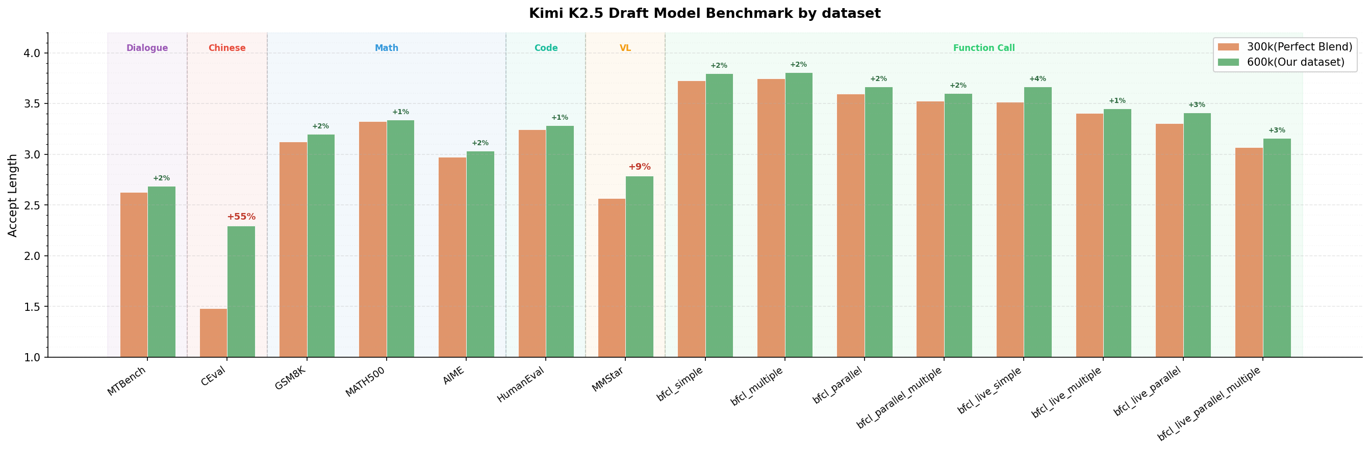 With TorchSpec, we successfully trained a Kimi K2.5 EAGLE-3 draft model with 1500 H200 GPU hours, scaling to 600k training samples. The draft model shows strong performance over various benchmarks: