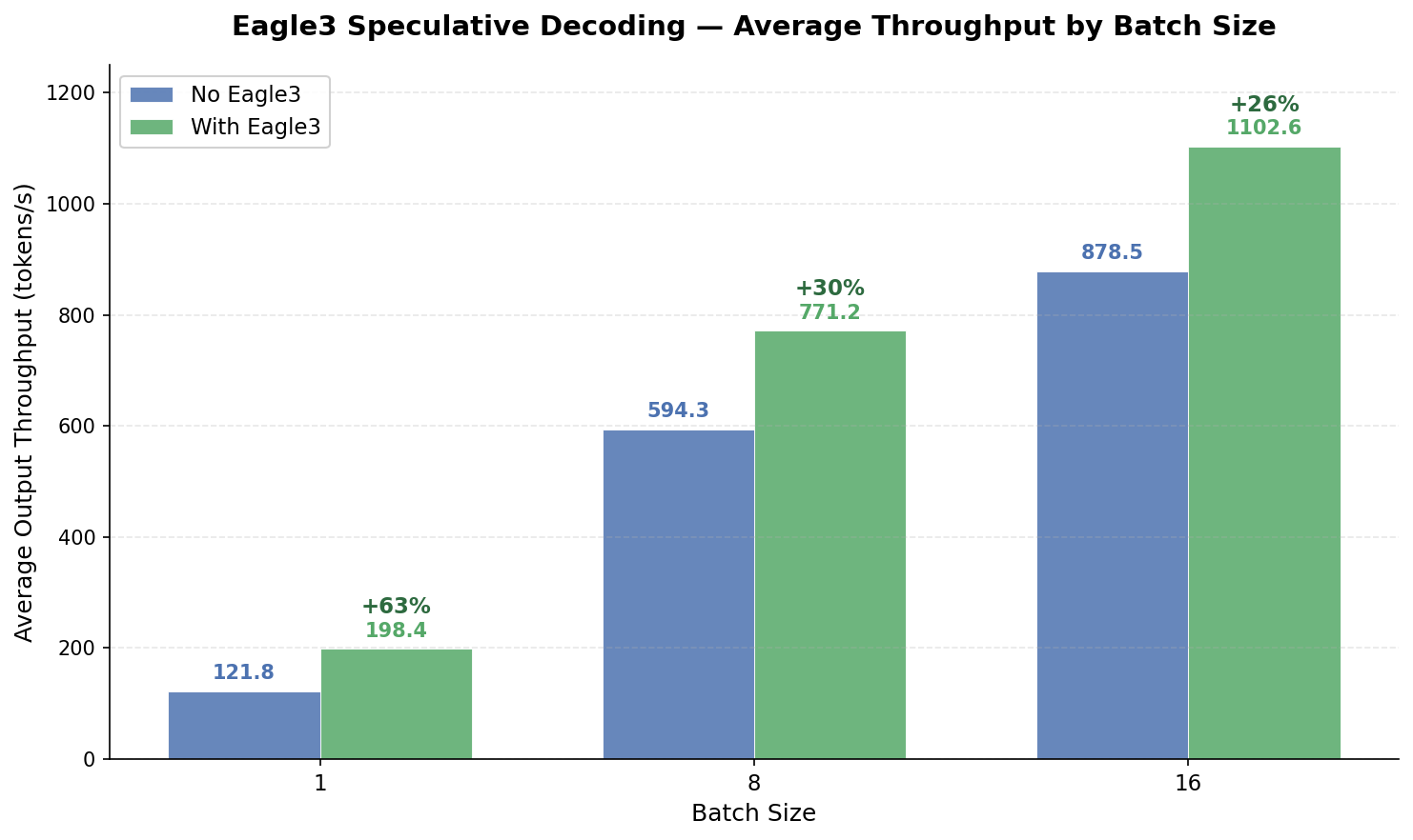 With the draft model trained, output throughput improves by +60% at batch size 1, +30% at batch size 8, and +26% at batch size 16 under a lookahead of 3 tokens.